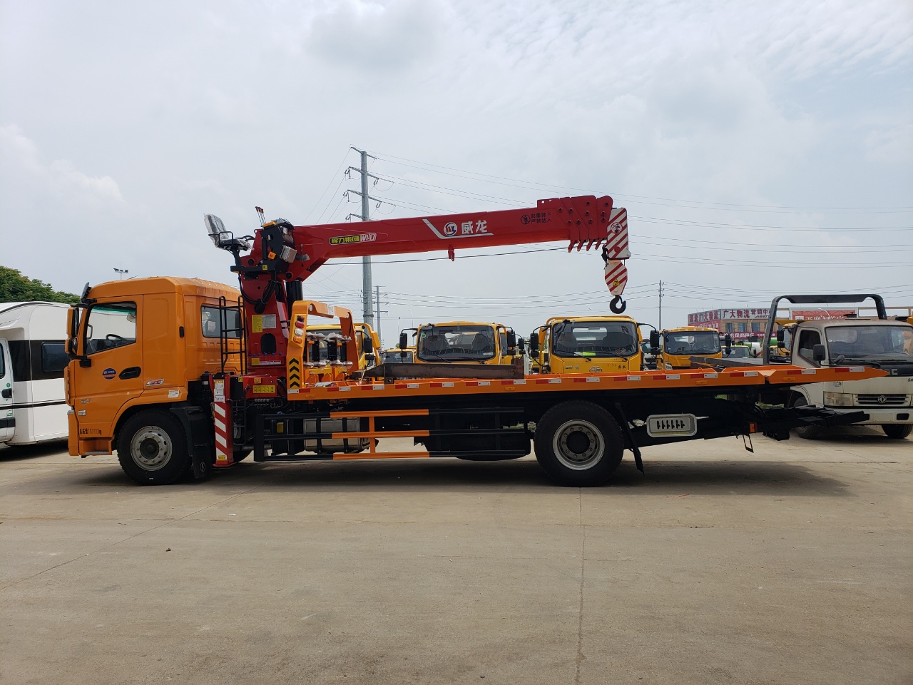 上裝配置:板長6.8米,寬2.55米,平板10噸上裝,5mm花紋板,邊框50*150(可選配實心鋼板),滑道10個厚,加厚雙副架,后托可做主梁承載10噸三節臂,10噸液壓卷揚,雙側聯動裝置,意德利海德多路閥,叉具一套,其余標配。