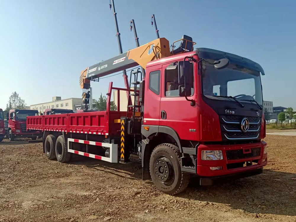 上裝:駿通12噸四節臂吊機,舉升高度17.5米,工作半徑15.5米,支腿跨距5.8米,吊機二節臂單出可帶載伸縮5噸,大臂升完可吊1.5噸,自動收鉤,標配通副梁,散熱器,東風原廠貨箱